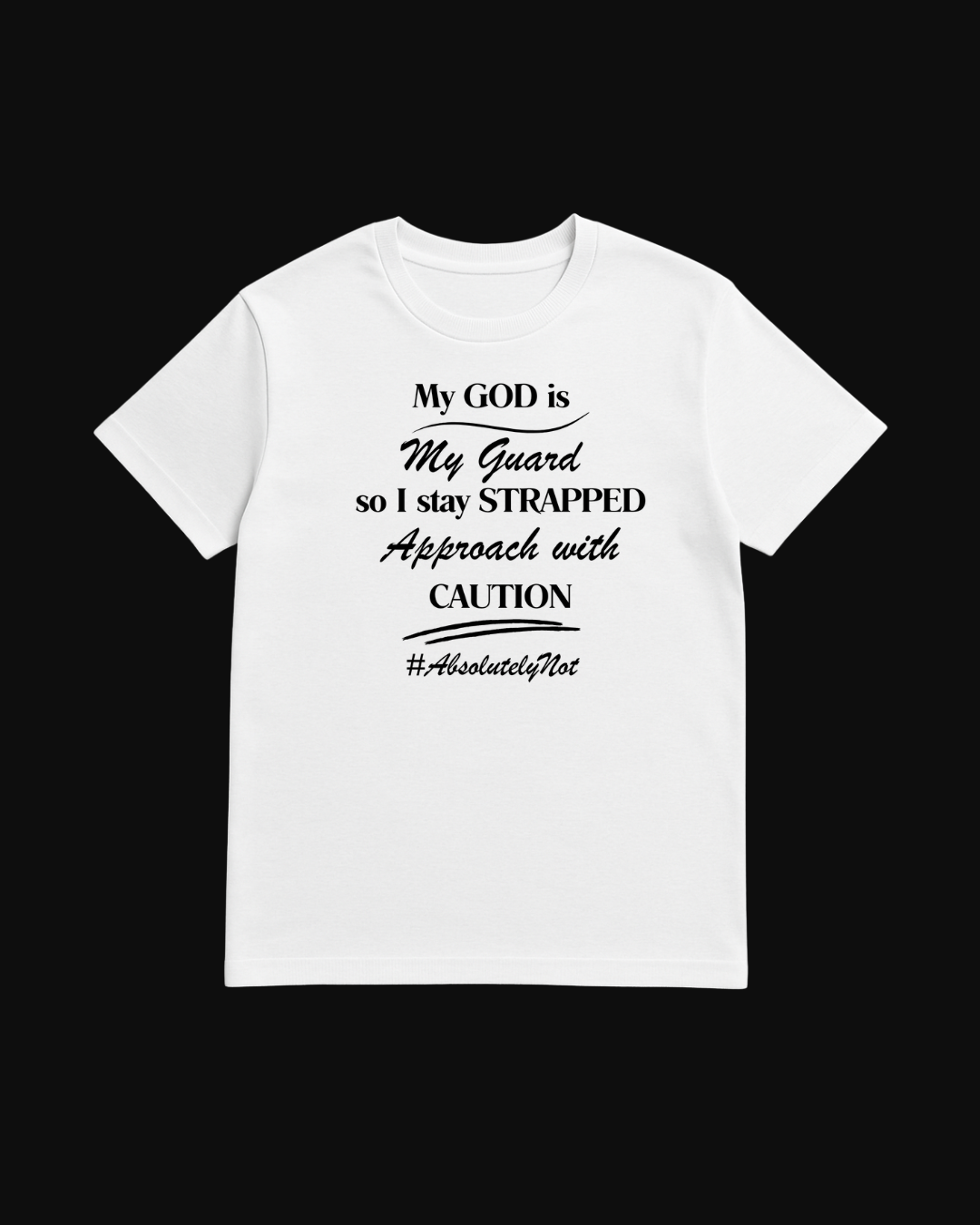 My God is my guard, so I stay strapped—approach with caution. This tee blends faith with fierce energy, reminding everyone that your protection is divine. Perfect for the bold believer who walks with purpose, covered and confident. #AbsolutelyNot